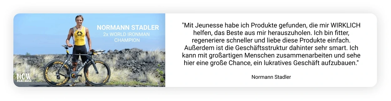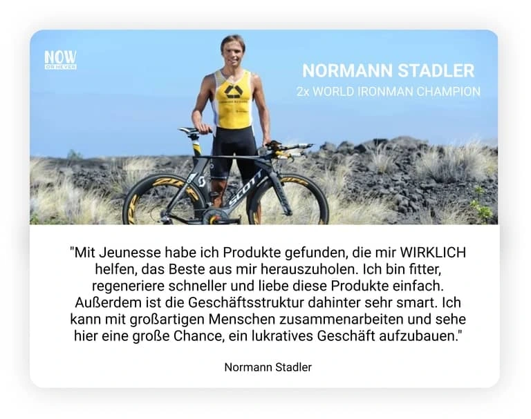 “Jeunesse ist eine außergewöhnlich Firma, mit einer enormen Vision für die Zukunft. Das Team NowOrNever vereint sehr erfolgreiche Menschen mit hohen Werten und einem mega Spirit!”