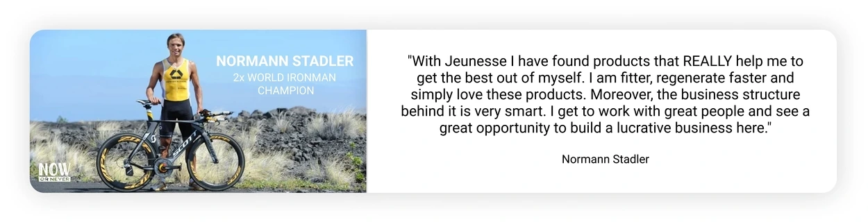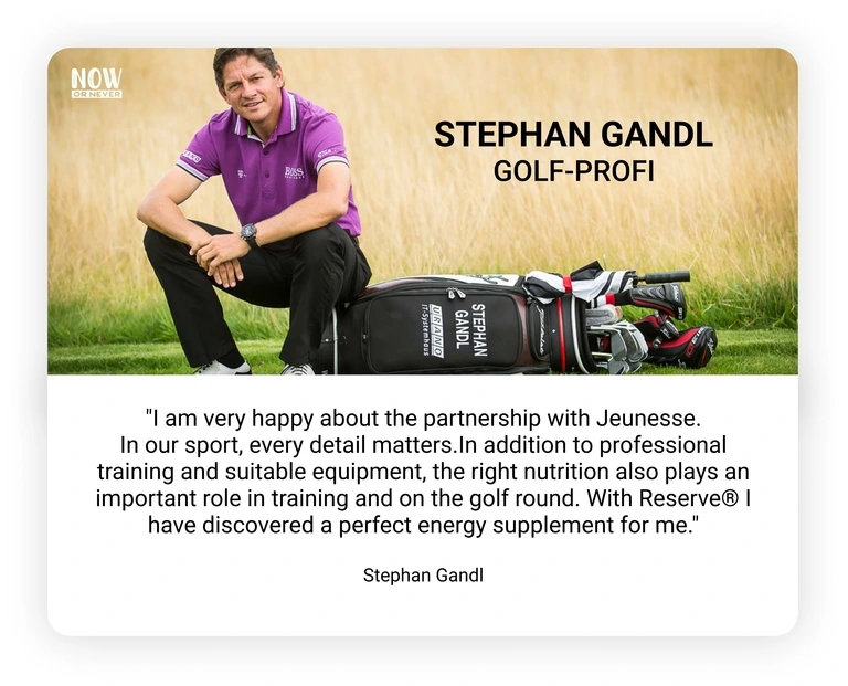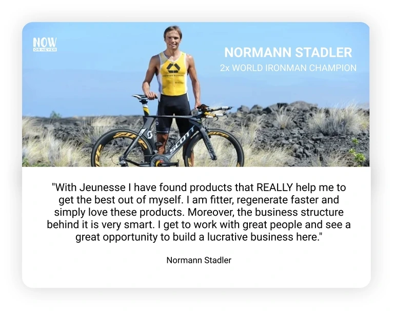 We live and love the topics health, sports and wellness - therefore Jeunesse creates a product world with which we can work very professionally. With the team Now or Never we learn every dday, expand our network and can develop in a way that we can't do anywhere else.